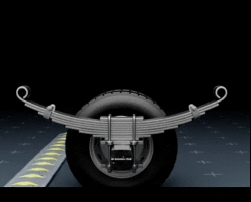 Composed of multiple layers of hardened steel plates stacked together, connected to the trailer frame and axle via shackles and brackets. It achieves shock absorption and load support through the elastic deformation of steel plates.