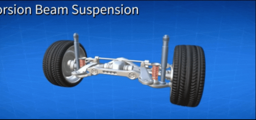 Features a metal tube housing rubber cords; wheels connect via swing arms to the rubber assembly. Independent wheel movement is enabled through torsional deformation of the rubber, with each wheel operating independently.